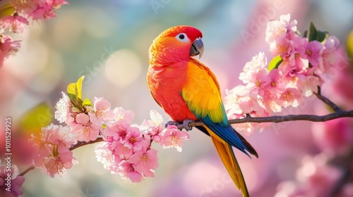 Vibrant parrot perched on blooming peach tree branch, embodying joy and prosperity, a symbol of good fortune in feng shui settings