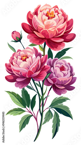 Vibrant Peony Illustration With Detailed Petals and Leaves - A colorful illustration of a peony flower showcasing vibrant petals and lush green leaves, capturing beauty and elegance in nature's design