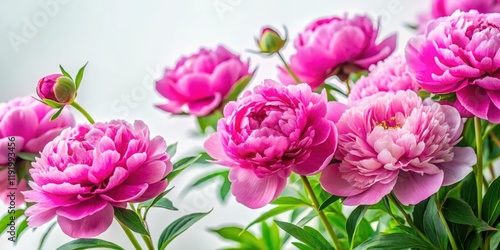 Vibrant pink peonies against a soft white background with delicate green leaves