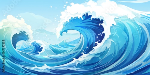 Vibrant Playful Ocean Waves in Cartoon Style Illustration. Dynamic Blue Sea Wave, Surf, and Foam Art