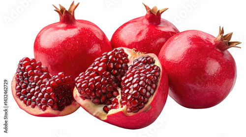Vibrant Pomegranates: A close-up shot showcases juicy pomegranates, whole and sliced, revealing ruby-red seeds. Perfect for culinary, health, or artistic uses.