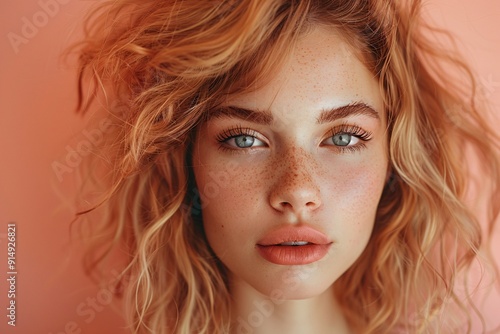 Vibrant Portrait of a Young Woman with Peach Makeup and Freckles