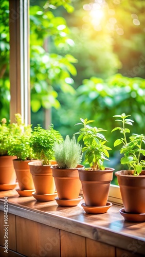 Vibrant potted herbs on sunny windowsill, terracotta pots, fresh green foliage, bright natural light, healthy home gardening.