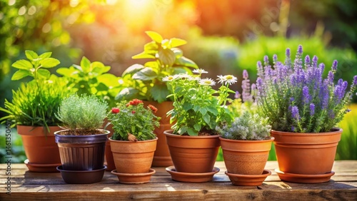 Vibrant potted herbs such as mint chamomile lavender and marjoram nestled among decorative terra cotta containers basking in the gentle sunlight , potted plants, flora