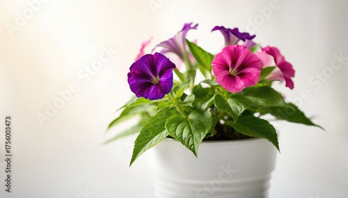 Vibrant potted petunia blossoms with green leaves against a clear backdrop
