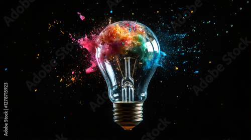 Vibrant powder bursting from shattered light bulb, symbolizing creative energy against dark backdrop