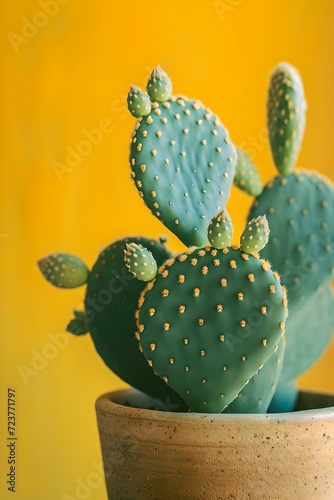 Vibrant prickly pear cactus in a clay pot against a yellow background. perfect for interior design themes. modern botanical style photo. AI