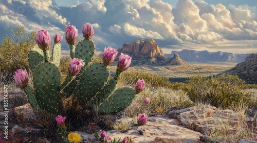Vibrant prickly pear cactus in bloom against a stunning desert landscape with dramatic clouds and distant mountains