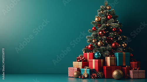 Vibrant pyramid of colorful presents resembling a Christmas tree, perfect for holiday marketing, greeting cards, or seasonal promotions. Ideal for joyful celebrations.