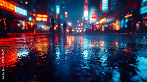 Vibrant Rain Soaked City Street at Night with Neon Lights and Reflections : Generative AI