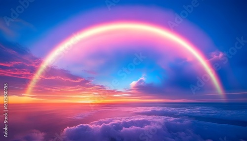 Vibrant rainbow arches over a colorful sunset sky.
