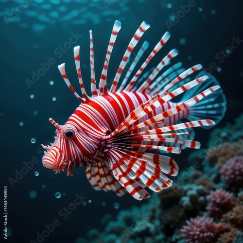 Vibrant Red and White Lionfish Swimming Gracefully in a Colorful Coral Reef Underwater Scene