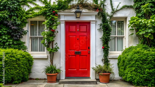 Vibrant red door on white house with greenery, red, door, vibrant, white house, greenery, exterior, entrance, home