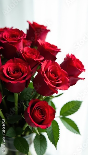 Vibrant red roses, lush bouquet, white background, red roses, stems, macro