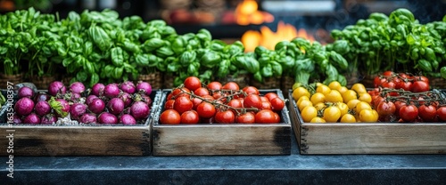 Vibrant red, yellow, and purple vegetables arranged in wooden crates, complemented by fresh green basil
