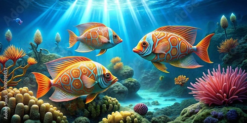 Vibrant Reef Inhabitants Three Ornate Fish Gracefully Swim Amidst Lush Coral and Underwater Flora, Bathed in Sunlit Rays
