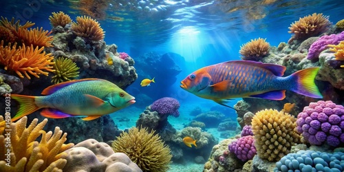 Vibrant Reef Scene Featuring Two Colorful Parrotfish Swimming Amidst Lush Coral and Anemone