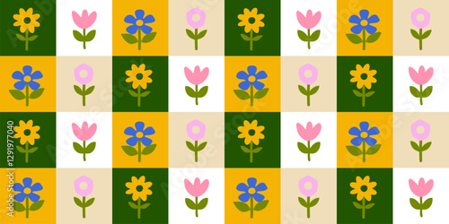 Vibrant Retro Floral Seamless Pattern Illustration – Hand-Drawn Vintage Flower Art for Spring-Inspired Textile and Nature-Themed Designs