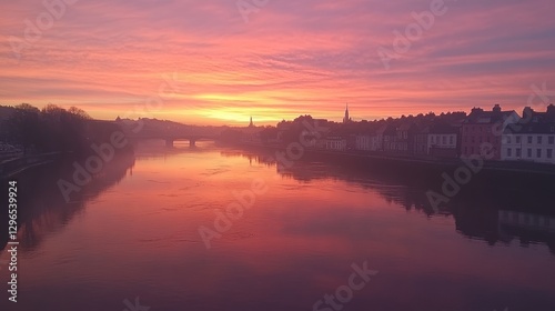 Vibrant River Cityscape at Dawn with Colorful Sky Reflection