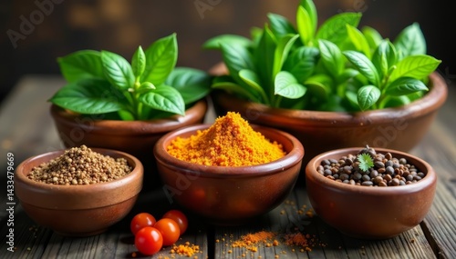 Vibrant selection of detoxifying herbs and spices in rustic bowls, healthcare, colorful