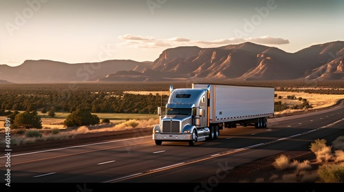Vibrant Semi Truck on Open Road: Expansive Desert Mountain Landscape Backdrop