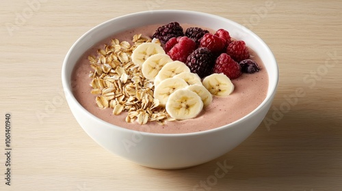Vibrant smoothie bowl topped with berries, bananas, and coconut flakes, arranged to show a nutritious plant-based breakfast in natural light.