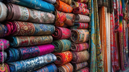Vibrant soft fabrics in a full frame display at an Egyptian street bazaar