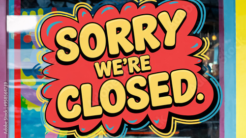 Vibrant "Sorry We're Closed" sign with bold yellow lettering in a comic-style red burst. Eye-catching, playful design with bright colors, perfect for a fun and energetic storefront display.