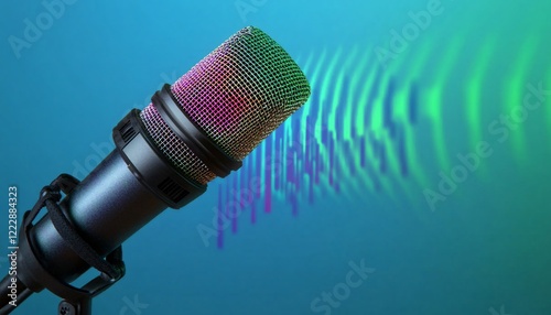 Vibrant soundwaves emanating from a sleek microphone, embodying the essence of engaging conversations and storytelling in the world of podcasting.