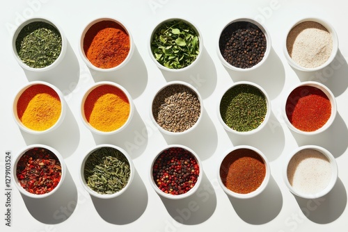 Vibrant spices arrangement kitchen counter food photography bright light top-down perspective culinary art
