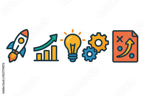 Vibrant startup icon set: rocket launch, growth arrow, lightbulb, gears, business plan