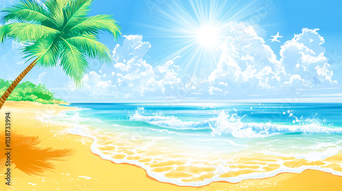 Vibrant summer vector background featuring beach illustrations, perfect for creating eye-catching banners, cards, flyers, and social media wallpapers, evoking a fun and sunny atmosphere