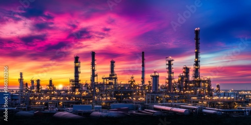 Vibrant sunset over an industrial complex with numerous structures lighting up the evening sky