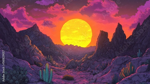 Vibrant Sunset Over Desert Landscape with Colorful Rock Formations