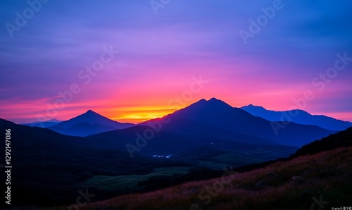 Vibrant sunset over mountain range, valley below