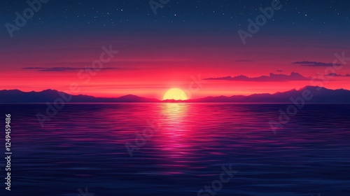 Vibrant sunset over ocean mountains, peaceful evening sky, nature background, travel poster
