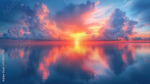 Vibrant Sunset Reflection on Calm Water Surface with Colorful Clouds.
