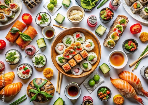 Vibrant Sushi Platter Top View: Appetizing Array of Delectable Dishes on White Background