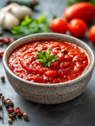 Vibrant Tomato Sauce: A Culinary Symphony of Fresh Flavors in a Rustic Bowl, Garnished with Herbs and Spices for a Delicious Meal