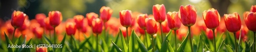 Vibrant tulips in a lush spring garden bursting with color; sun-drenched petals, fresh green leaves, blossoming flowers, a scene of renewal and growth , flourishing, gorgeous, flowers