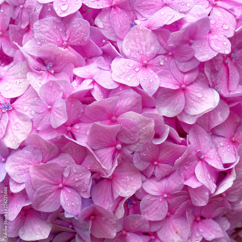 vibrant violet colored hortensia wet flower close up, natural pattern background