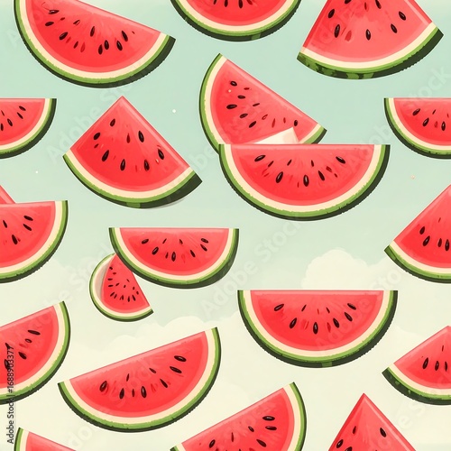 Vibrant watermelon slices scattered against a light sky
