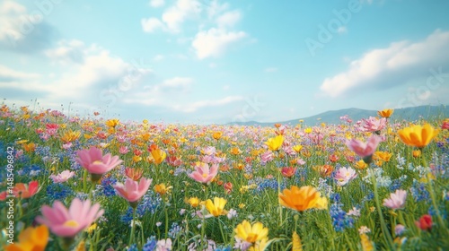 Vibrant wildflower meadow under a bright blue sky with scattered white clouds, evoking a peaceful and lively springtime atmosphere