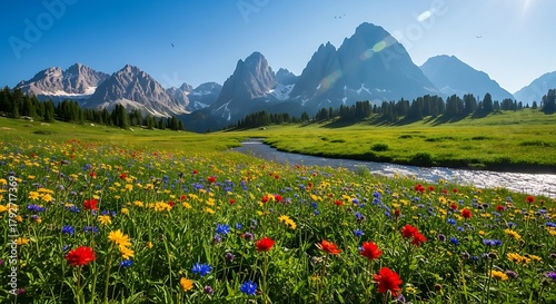 Vibrant Wildflower Meadow with River and Majestic Mountains.