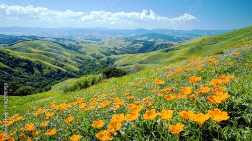 Vibrant Wildflower Meadow with Rolling Green Hills and Scenic Blue Sky Illuminated by Soft Sunshine in a Picturesque Nature Landscape