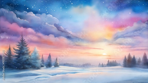Vibrant Winter Sunset Over Snowy Fields, Watercolor Winter Background