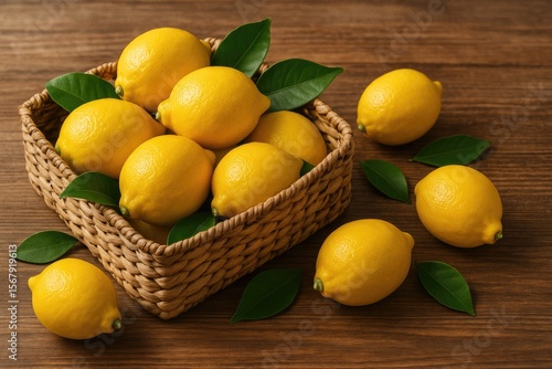 Vibrant yellow citrus fruits with green leaves arranged in a basket on a rustic wooden surface