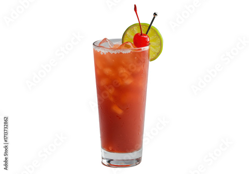 Vibrant Zombie cocktail, elegant tall glass, lime wheel, cherry, transparent studio background, 45-degree angle commercial product photography, concept of sophisticated appeal