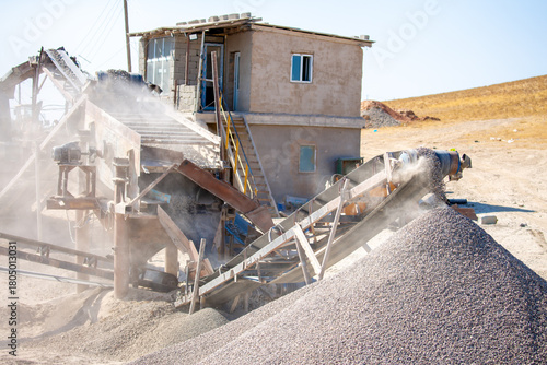 Vibrating screen stone crusher in operation. Crushing stones in a quarry for processing minerals, cement, limestone. Heavy and mobile equipment in a quarry for processing stone into building material.
