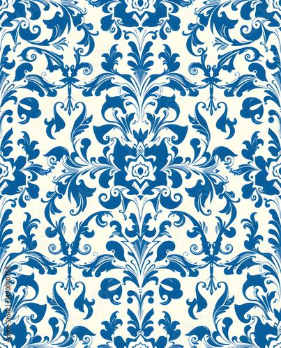 Victorian Baroque floral with blue damask curls elegance, seamless pattern.